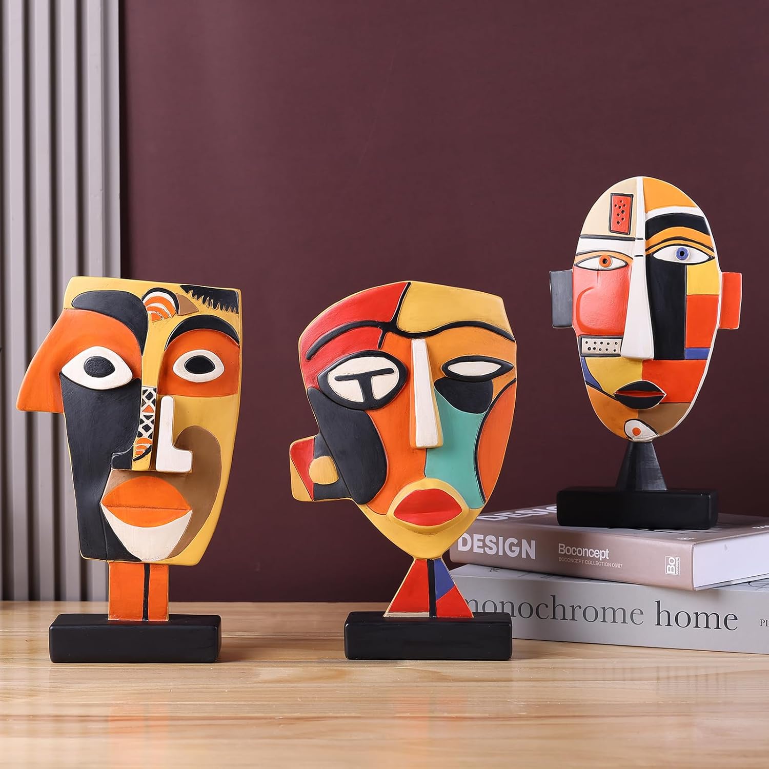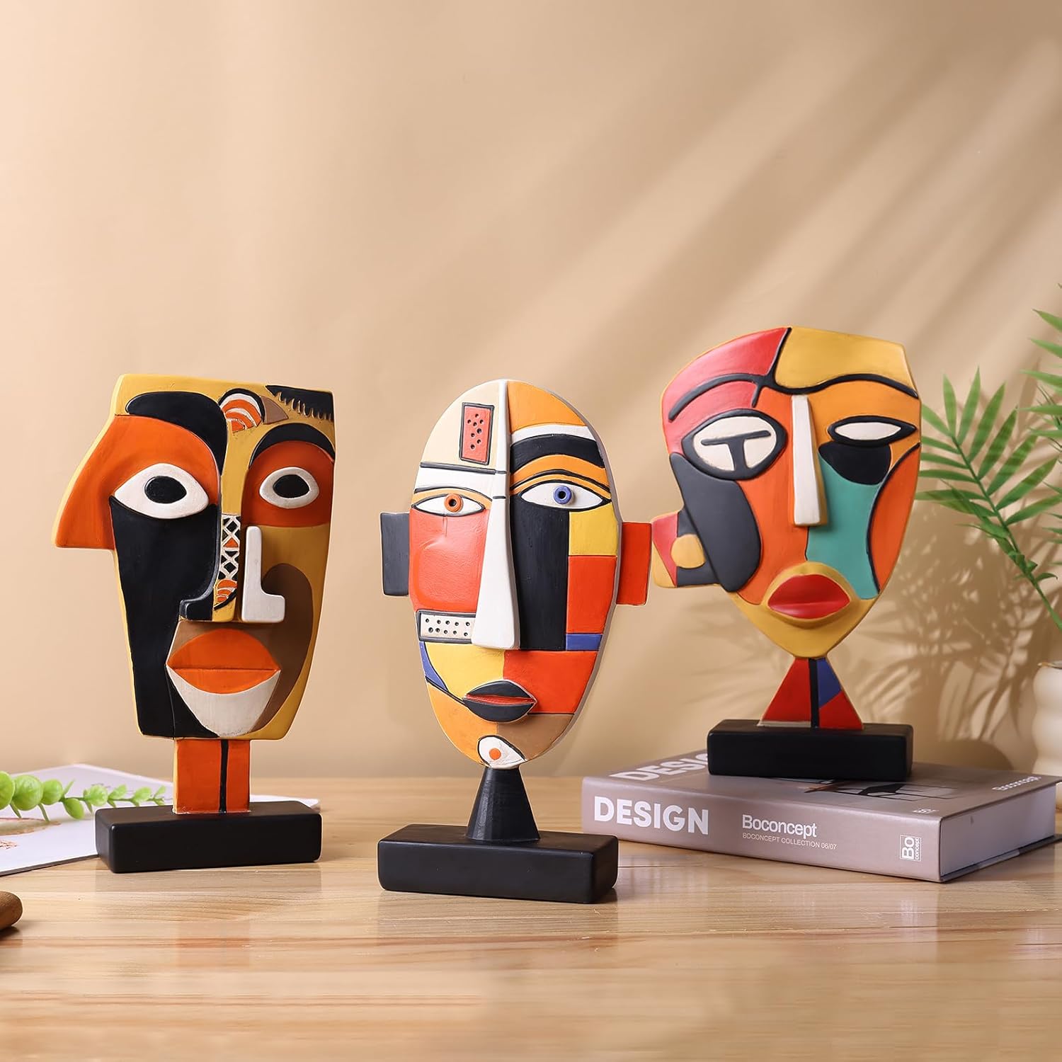 Exquisite Abstract Design: It contains three abstract coffee – table – decorating sculptures. Inspired by African art, their designs feature bold and vibrant colors. These quirky and interesting small statues are meticulously carved from resin masks. The unique facial sculpture and artistic face – mask shapes showcase the perfect integration of modern and trendy art, instantly enhancing the characteristics of the space.