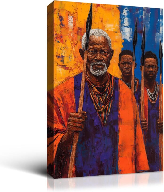 Transform your living space with this striking African-inspired canvas wall art. The dramatic composition features vibrant orange traditional robes contrasting against a deep blue background, creating a powerful visual statement. The artwork captures a moment of cultural dignity and leadership, with traditional garments and ceremonial staffs prominently displayed. This stunning piece measures approximately 12×16 inchs, making it an ideal focal point for your bedroom, living room, or office space. The high-quality canvas print brings depth and texture to any wall, while the contemporary styling allows it to complement both modern and traditional decor schemes. The rich color palette of orange, blue, and earth tones adds warmth and sophistication to your interior design. Perfect for collectors of African art or anyone seeking to add a bold, cultural statement to their home decor.