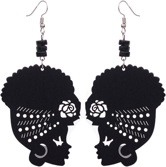 Wooden Flower Turban African Woman Head and Rasta Bead Dangle Hook EarringsPierced Hook EarringsEarring Dimensions: 3.5″ x 1.8″Dangle EarringsMultiple Colors, Black Bead