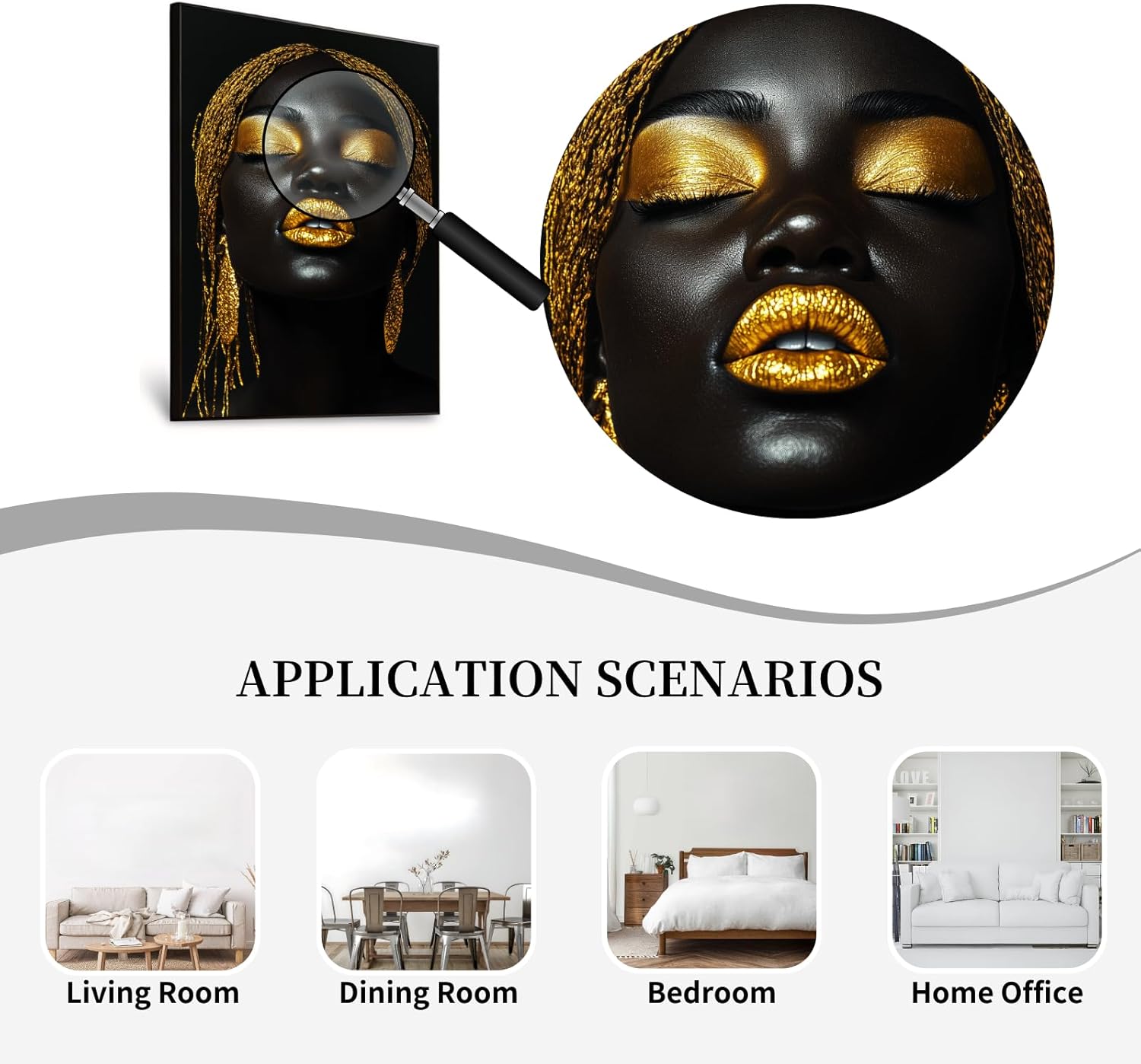 This African woman themed canvas frame artwork interprets modern African aesthetics with black and gold colors, and is designed to enhance the artistic style of the space. The black and gold wall art is printed with high-grade oil canvas and environmentally friendly ink. The picture is rich in color and fade-resistant. With the frame, it shows a luxurious texture for a long time. The black woman wall art can easily become the main wall of the living room, the head of the bedroom bed or the background wall of the office, and become the visual focus. The african art wall decor frame has a pre-installed reinforced hook on the back, which can be hung out of the box without installation. It is not only a tasteful choice for home decoration, but also suitable as a collection gift for weddings, housewarming, Mother’s Day, etc.