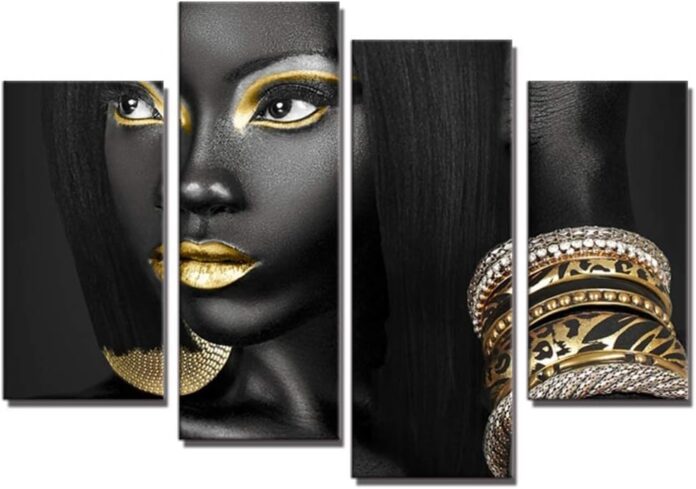 USAGE EASY:Better printed canvas stretched and stapled to frames.The frame has been stretched and can be hung directly.Waterproof,UV-resistant,color fading-resistant more than 50 years indoor.High resolution giclee printing on premium canvas.black artwork african girl canvas painting print gold african female portrait canvas