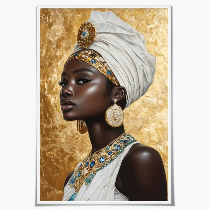 African Black Woman Picture: This african art poster features an African queen wearing gold and blue jewelry with a white headdress, against a gold leaf background, with dark black skin The style is digital art painted in the style of oil paint, making it an ideal piece for those who want to showcase their African pride in an elegant and modern way