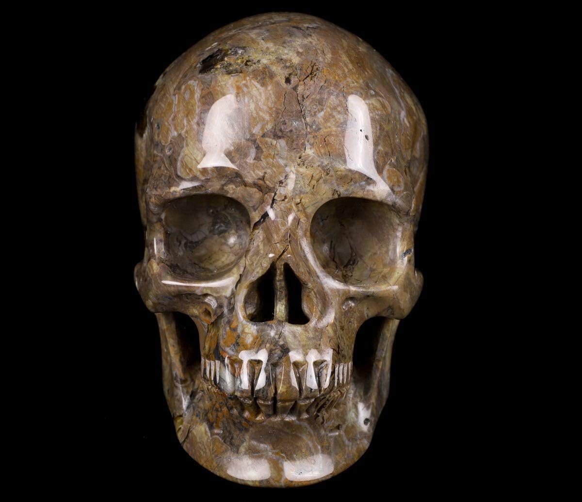 Beautifully Carved Fine Art: Natural gemstone sculpted with our exclusive crystal Realistic skull design (Dinosaur Egg Agate).