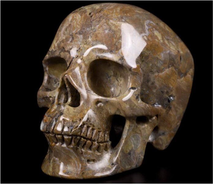 Beautifully Carved Fine Art: Natural gemstone sculpted with our exclusive crystal Realistic skull design (Dinosaur Egg Agate).