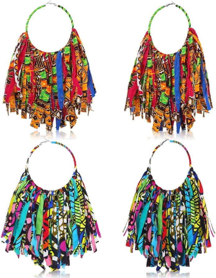 Customers find these earrings beautiful and colorful, with one describing them as big statement pieces. The size receives mixed feedback, with some loving the size while others find them too large. The fabric is stiff, and customers express disappointment with the overall quality.