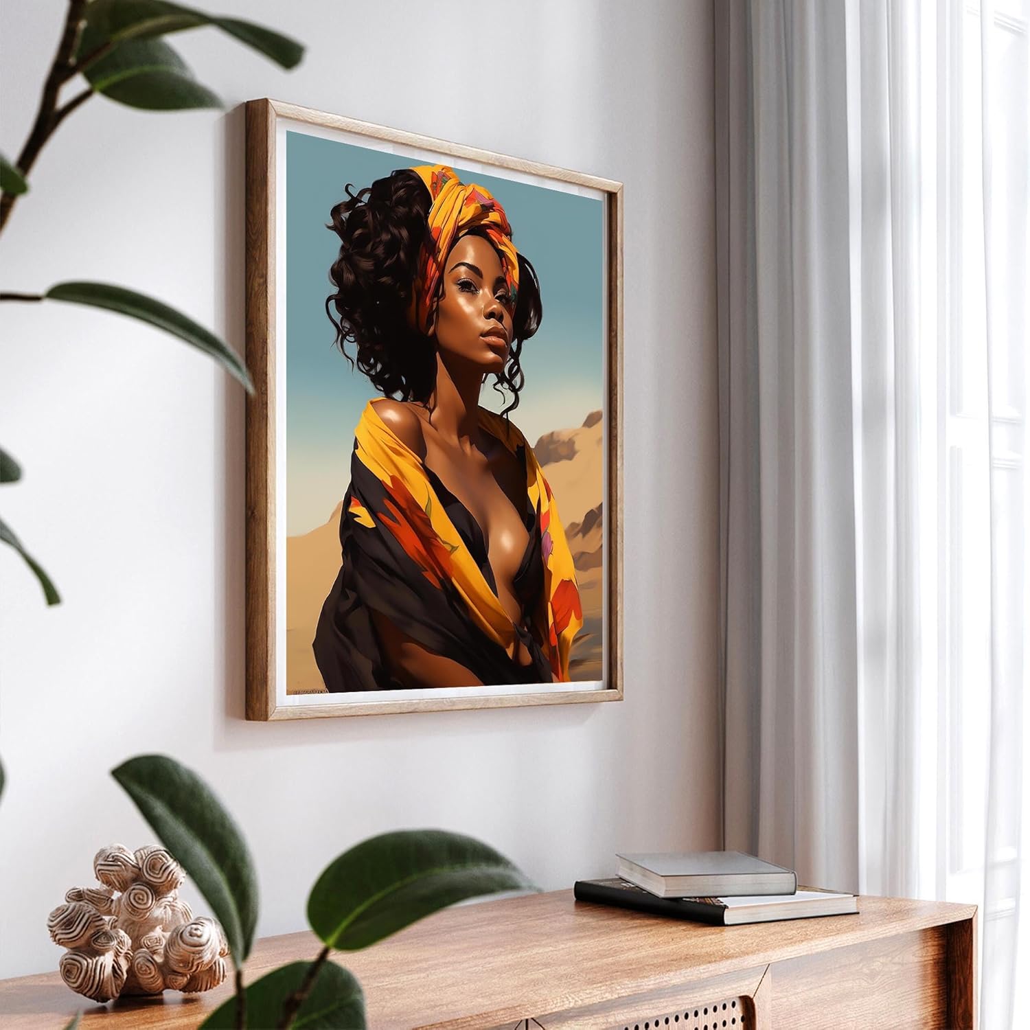 In a vast desert, a woman stands with a sense of dignity and strength. Her vibrant scarf and the warm colors of her attire contrast with the dry landscape, symbolizing resilience and inner beauty. The serene sky above hints at peace and hope, capturing a moment of quiet reflection.