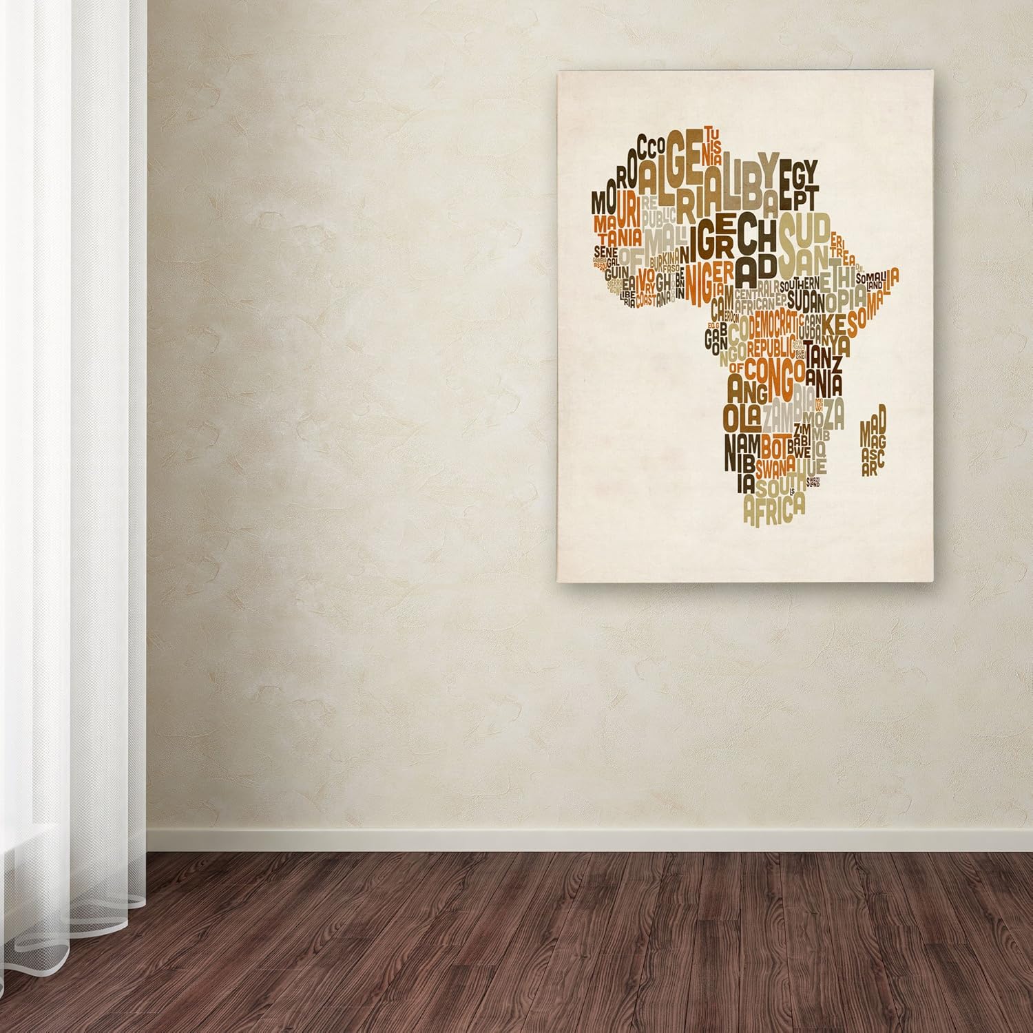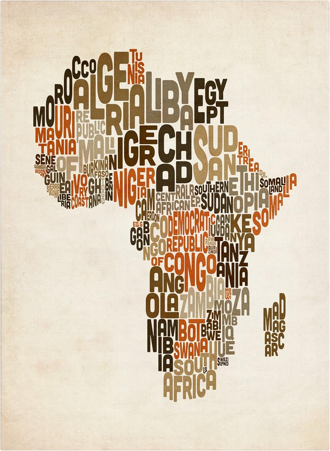 This ready to hang, gallery wrapped art piece features a text map of Africa. Art and design were always Michael’s favorite subjects at school. He was fortunate to land a job as a graphic designer at one of London’s most prestigious publishing companies. After 12 years Michael Topsett made the decision to pursue a full-time career creating his own work. The freedom and time to be able to focus solely on his own projects has been a wonderful experience. Athrough Michael likes to experiment with different styles and subjects, hi main focus is on map art. He enjoys looking for unique and interesting ways to depict something which is very familiar. Maps are visual representations of the world we live in, a world which is incredibly diverse. Apart from maps, Tompsett creates urban landmark and cityscape designs. Giclee (jee-clay) is an advanced printmaking process for creating high quality fine art reproductions. The attainable excellence that Giclee printmaking affords makes the reproduction virtually indistinguishable from the original piece. The result is wide acceptance of Giclee by galleries, museums, and private collectors. Gallery wrap is a method of stretching an artist’s canvas so that the canvas wraps around the sides and is secured a hidden, wooden frame. This method of stretching and preparing a canvas allows for a frameless presentation of the finished painting.