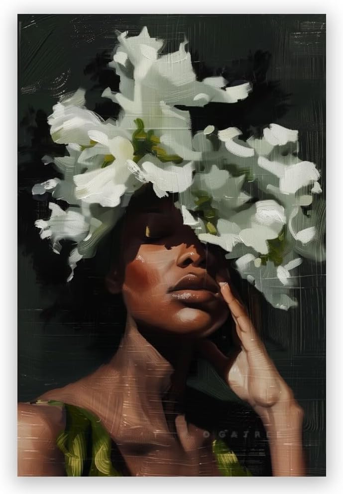 Black Woman Wall Art: This wall decor showcases “An oil painting of an exotic woman with white flowers”,bringing a mystery touch and adding playful elements to your space.frames add elegance,unframed provides a minimalist look