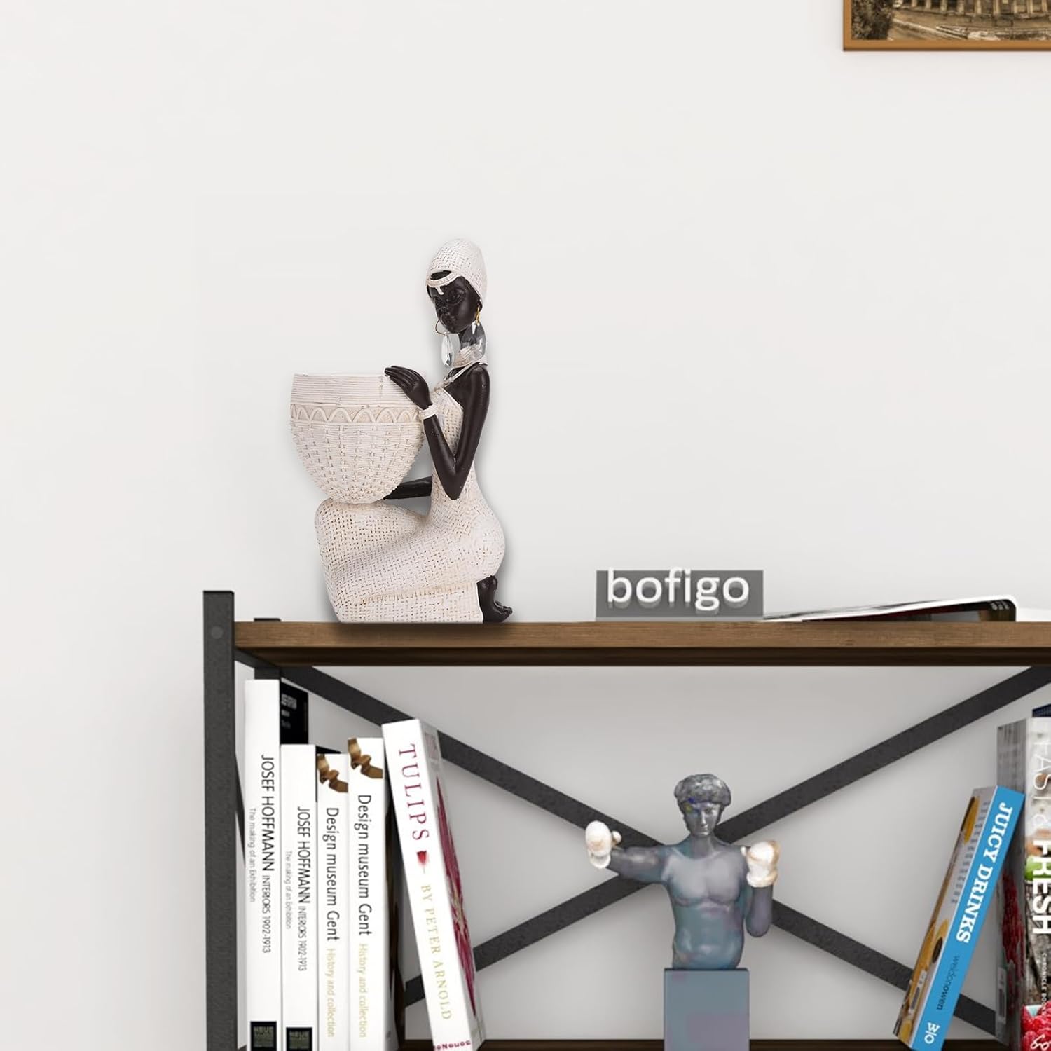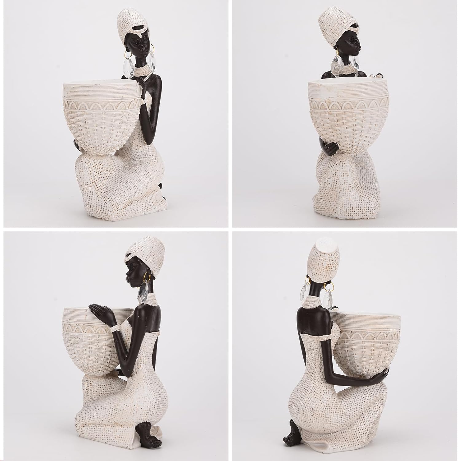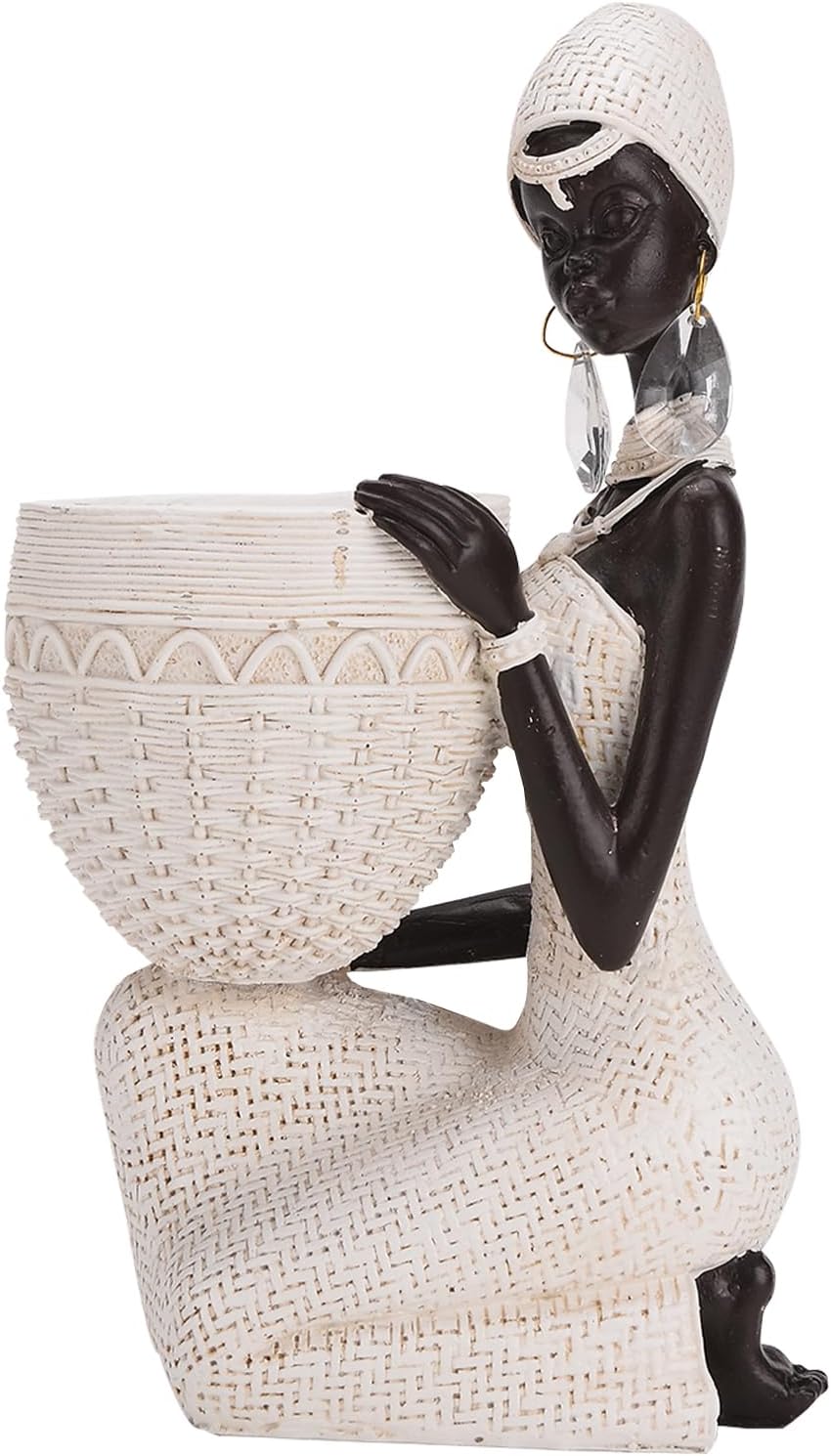 This striking home decor piece showcases an African woman’s figure crafted from resin, adorned with intricate woven details. The kneeling figure features a black torso and head contrasted against a cream-colored woven skirt, headdress, and basket tray. Earrings add a touch of elegance to her tribal-inspired look. Measuring approximately 9.1 inches tall, this sculpture makes a captivating centerpiece for your living room, bedroom, or entryway table. Its unique design celebrates African culture and artistry, adding a touch of global flair to your home’s ambiance. Whether you’re an art enthusiast or simply seeking a conversation-starting accent, this decorative tray and figurine set is sure to impress. Product name: Resin Woman Statue. Color: Black & White. Weight: 1.4 lb. Size: 5.5”x3.5”x9.1”. Material: Resin. Applicable space: Living room, Office, Study Room, Shop. Style: Simple and modern, Collection, home ornament. Function: Lucky, fortune. Decoration Type: Desktop Decoration. Note: 1. Due to manual measurement, there may be 0.5-1in error. The following data is for reference only, please understand in kind. 2.All pictures in this shop are 100% physical, color is the most accurate correction, because the display effect is different, the color is still difficult to avoid, please understand. 3. We will handle it for you with any quality and shipping problems. Dear friends, we are grateful for your choice.If you have any questions or suggestions, please contact us at any time.
