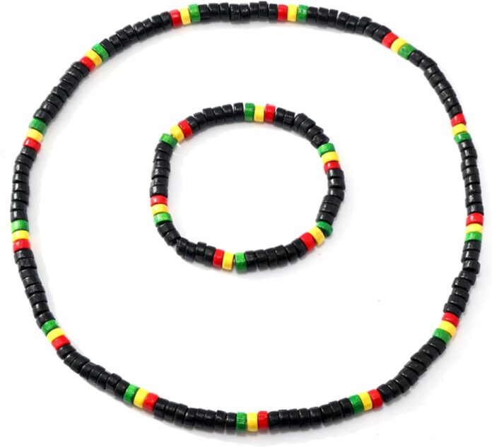 Celebrate heritage and freedom with this striking beaded jewelry set featuring a necklace and matching bracelet. The set showcases a beautiful pattern of black beads accented with vibrant red, yellow, and green elements – colors that hold deep cultural significance. Each piece is handcrafted with attention to detail, creating a meaningful accessory perfect for Juneteenth celebrations, Black History Month, or year-round wear. The versatile design works well with both casual and formal attire, making it suitable for various occasions. The necklace provides a balanced length that sits elegantly on the neckline, while the coordinating bracelet offers a comfortable fit. This distinctive jewelry set serves as both a fashion statement and a powerful symbol of cultural pride. Suitable for all genders, this set adds a meaningful touch to any wardrobe while honoring important historical and cultural celebrations.