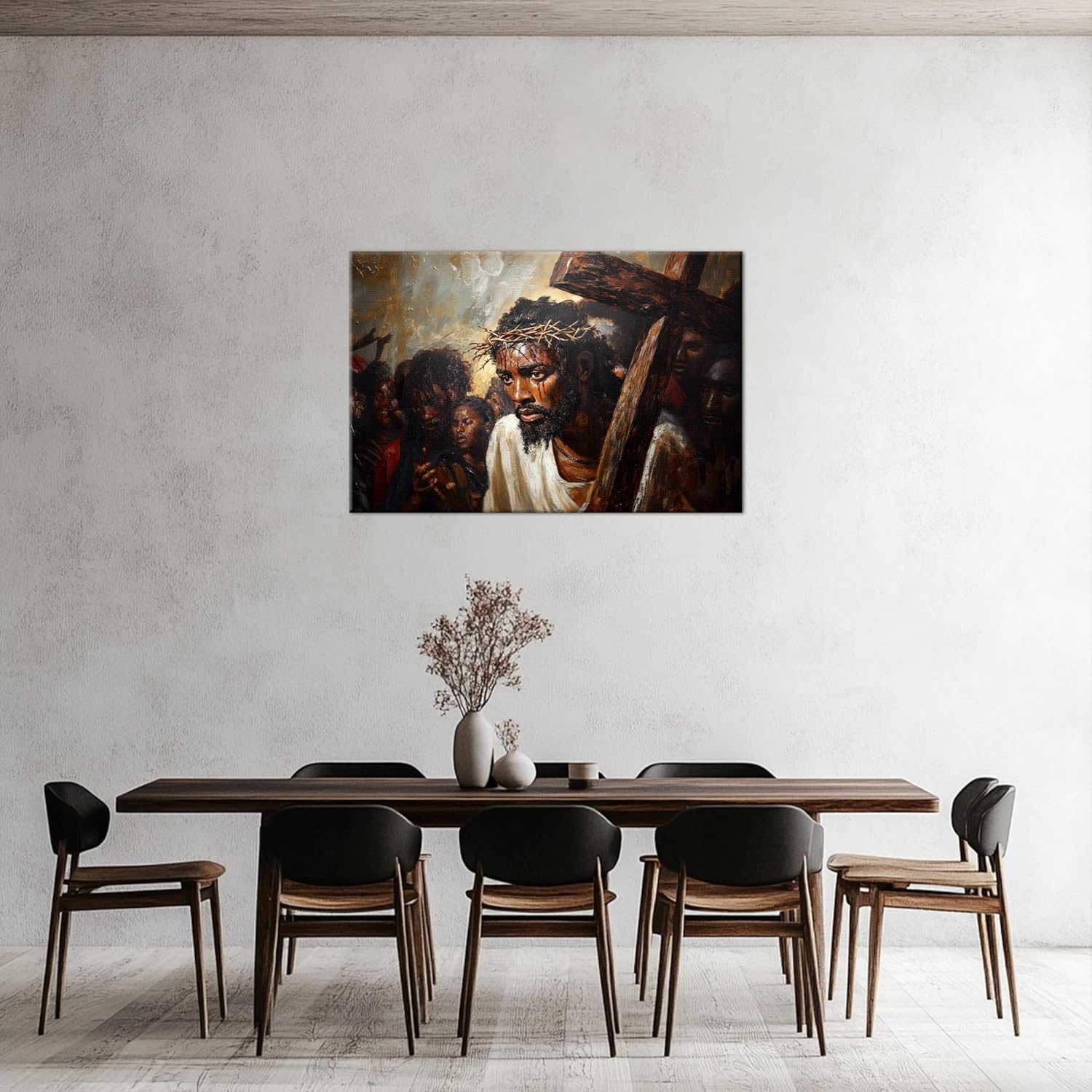 Unique Design: This black Jesus wall art authentically depicts Jesus as a black man. Skillfully integrating African American wall art elements, it’s a remarkable Jesus art wall decor. The detailed, warm-toned portrayal of Jesus’ grace and divinity immediately draws the eye, inviting spiritual reflection.