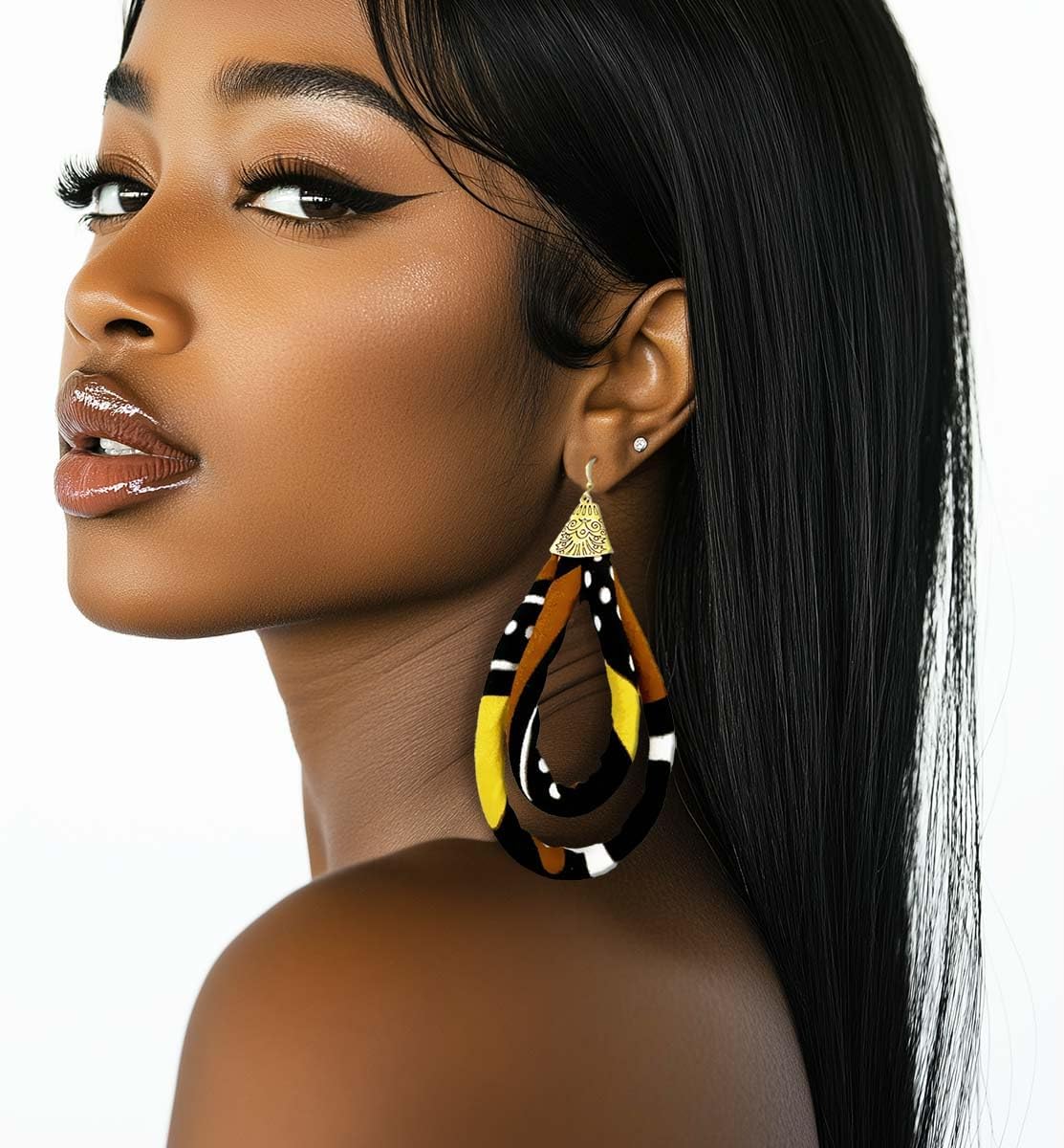 These Double Loop Mud Cloth Print Earrings have beautiful Earthy tones. This African wax print earrings has gold cone caps to secure the fabric following with gold earrings hooks. They’re perfect for an everyday look while still being fashionable!