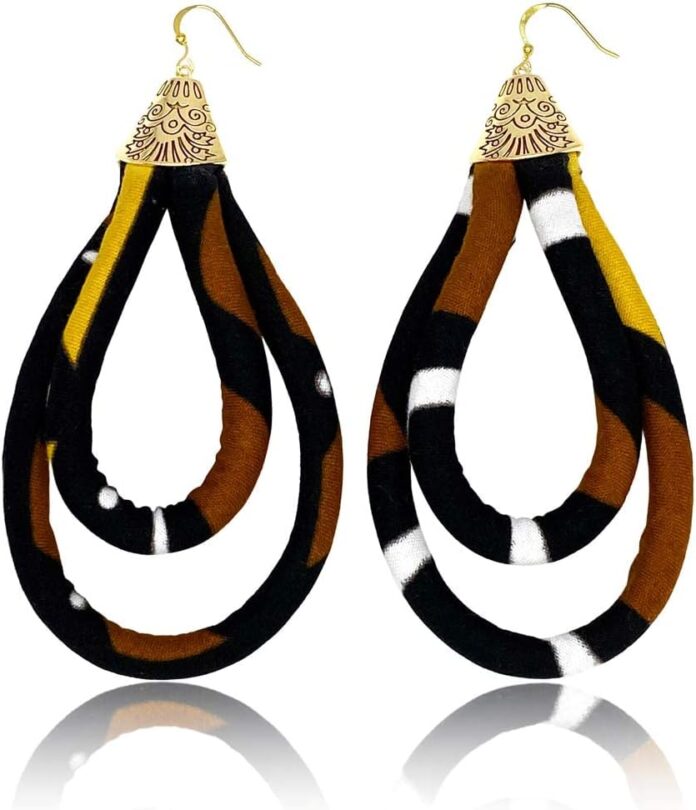 These Double Loop Mud Cloth Print Earrings have beautiful Earthy tones. This African wax print earrings has gold cone caps to secure the fabric following with gold earrings hooks. They’re perfect for an everyday look while still being fashionable!
