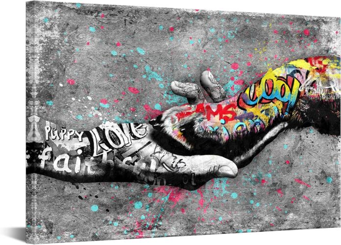 Unique Street Art Appeal: Featuring an abstract dog portrait with a compelling “Take My Hand” graffiti style, this canvas print captures the essence of urban artistry.