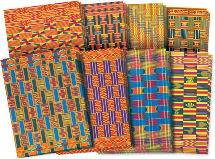 Roylco African Textile Paper measuring 8-1/2 x 11 inches is double-sided featuring two coordinated designs. It is sold as 32 per pack that includes 4 sheets each of 8 designs.