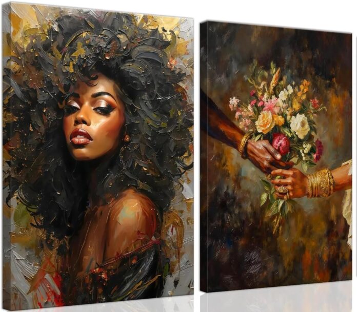 POWERFUL 2-PIECE ART SET – Features a stunning portrait of a confident Black woman and a symbolic painting of hands gently holding flowers. This curated duo tells a story of elegance, culture, and connection, designed to be displayed together for maximum impact