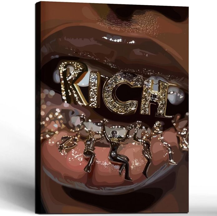 Bold “RICH” Statement Theme – Featuring a striking design with jewel-encrusted lips and the word “RICH” as the centerpiece, this artwork makes a bold and fashionable statement.